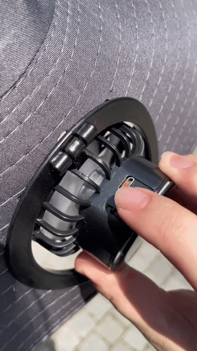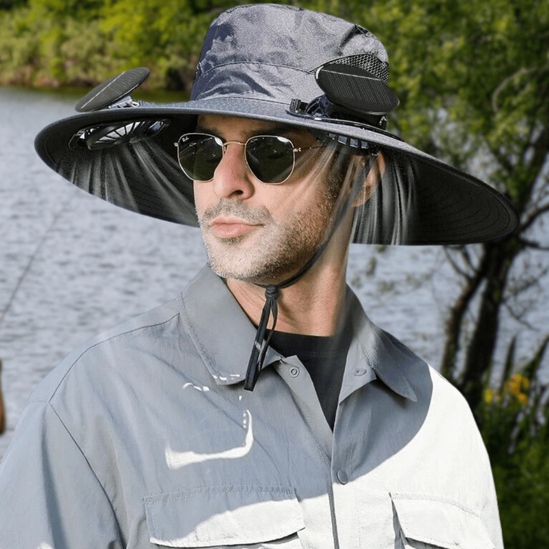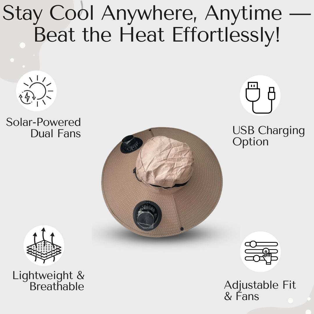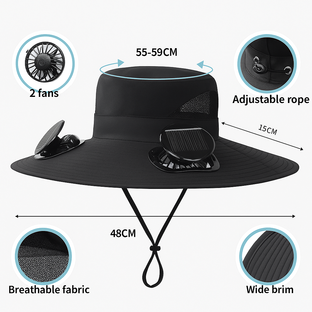 The hat features built-in dual fans powered by a solar panel on top. When exposed to sunlight, the fans automatically start cooling you down. It also includes a USB charging option for cloudy days.